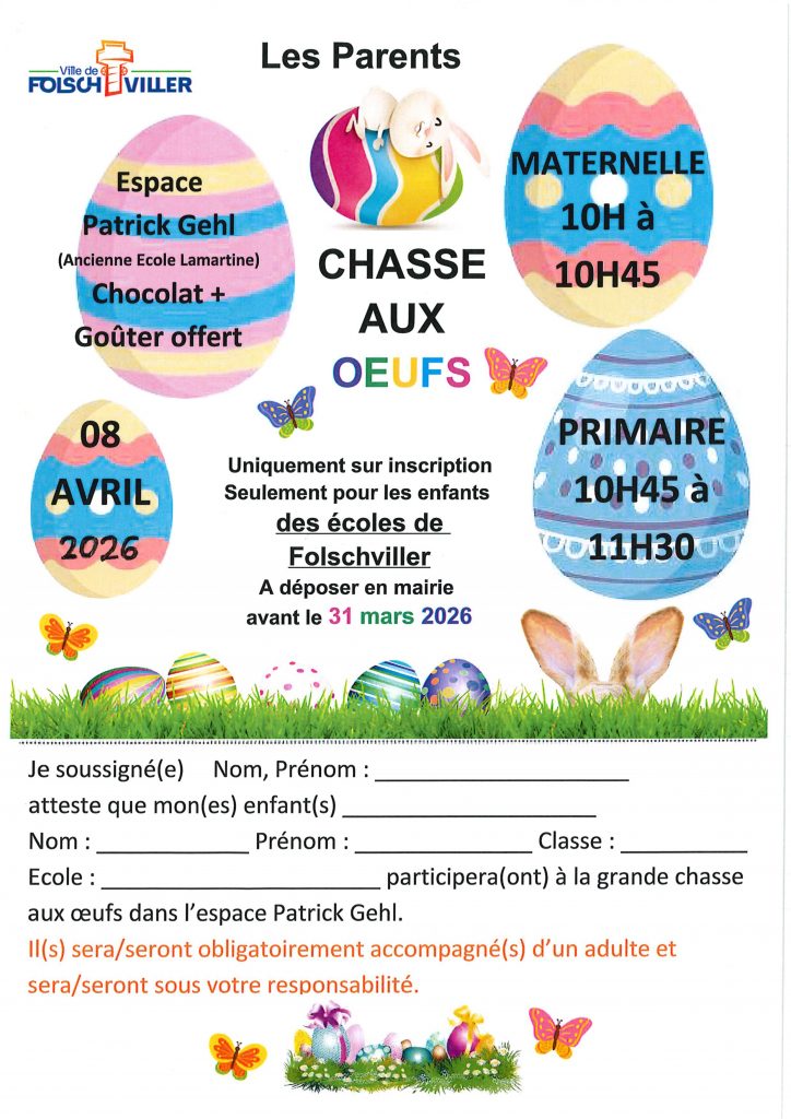 La Ville de Folschviller invite les enfants des écoles de Folschviller à participer à sa chasse aux œufs ! Rendez-vous le mercredi 8 avril 2026 à l’Espace Patrick Gehl (ancienne école Lamartine) pour un moment festif et gourmand autour de Pâques. Chocolat et goûter offerts Horaires : Participation uniquement sur inscription. Cette animation est réservée […]