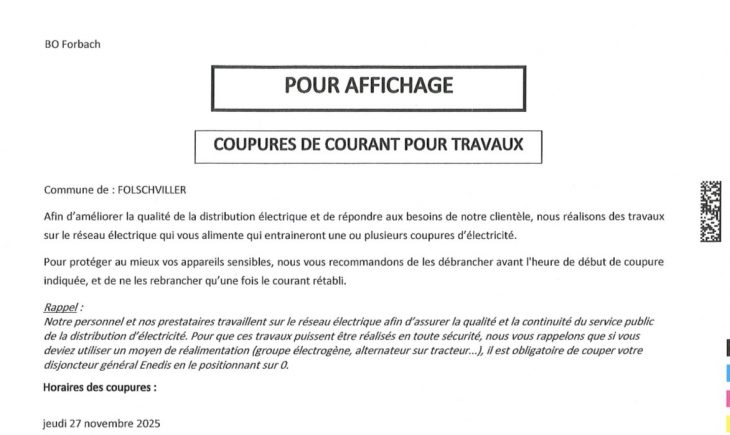 Enedis nous informe qu’une coupure de courant pour travaux aura lieu sur la commune de Folschviller afin d’améliorer la qualité du réseau électrique.