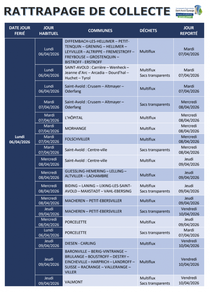 En raison du week-end pascal, la collecte des ordures ménagères au niveau de la commune se tiendra le Mercredi 8 avril 2026 (au lieu du mardi 07/04).